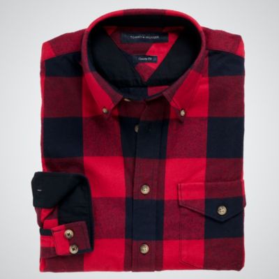 Tommy Hilfiger men's shirt. Bold and bright buffalo checks, borrowed from the hunting world and given the Tommy treatment. Softly brushed. Button-down collar. One flap patch chest pockets. Long sleeves with button cuffs, one with our tiny embroidered flag. 100% cotton.
