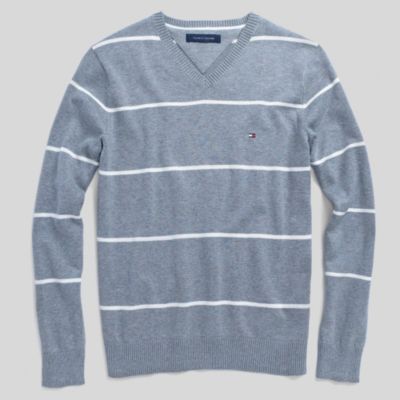 Tommy Hilfiger men's sweater. A rich color with slender stripes refreshes and refines the classic V neck. A little preppy, a little not, with lots of pairing possibilities. In a light, smooth knit with ribbed V neckline, cuffs and bottom. 100% Cotton. Machine Washable. Imported.
