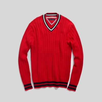 Tommy Hilfiger men's sweater. Some call it a cricket sweater. Some call it a tennis sweater. Call it what you like, it offers a timeless taste of tradition, whatever your game. A steadfast, weighty ribbed pattern with the requisite striped trim. V neckline. Striped ribbed cuffs and bottom. Flag logo embroidery near one cuff. 100% cotton. Machine wash. Imported.