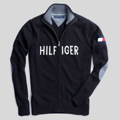 Tommy Hilfiger men's sweater. We've combined some of our favorite preppy details — intarsia designs, elbow patches and a zippered front — into a light but warm cardigan of pure, soft lambswool. Wear it open over a tee or zip it up and wear it solo. Ribbed mock turtleneck. Intarsia name across front and flag logo on one sleeve. Contrast elbow patches. Ribbed cuffs and bottom. 100% lambswool. Hand wash. Imported.