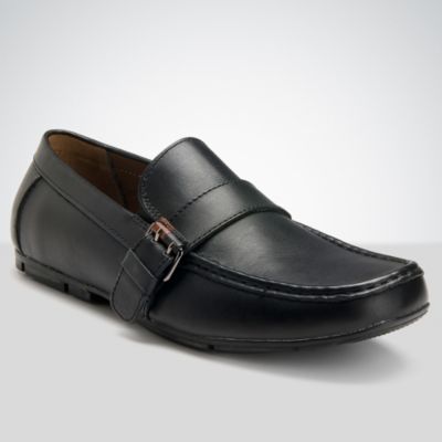 Tommy Hilfiger Men's Loafers. A tailored take on the leather driving moc, now detailed with a trim buckled strap across the vamp. Fully lined with cushioned insole. Back driving bumper. Flexible, non-skid driving sole. Imported.
