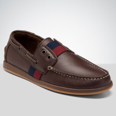 Tommy Hilfiger men's shoes. A handsome variation on the boat shoe theme in rich leather. A stretchy striped band across the vamp and fixed grommets offer slip-on ease. Laced leather detail and side stripes. Back welt and embossed flag logo at the heel. Padded insole. Leather lining. Non-slip rubber signature tread sole. Full-grain leather. Imported.