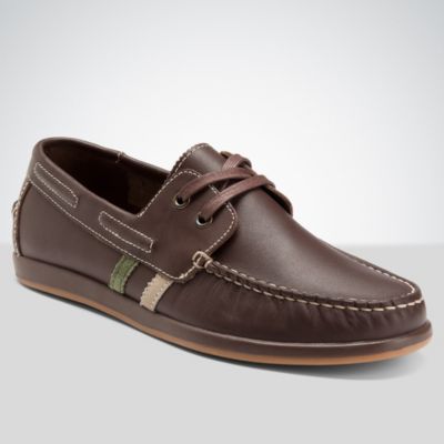 Tommy Hilfiger men's shoes. Effortless style and class, our leather boat shoe is an every day classic. Two-grommet styling. Leather upper with topstitched detailing and suede stripes at sides. Rubber tread sole. Rubber Tommy flag at heel. Imported.